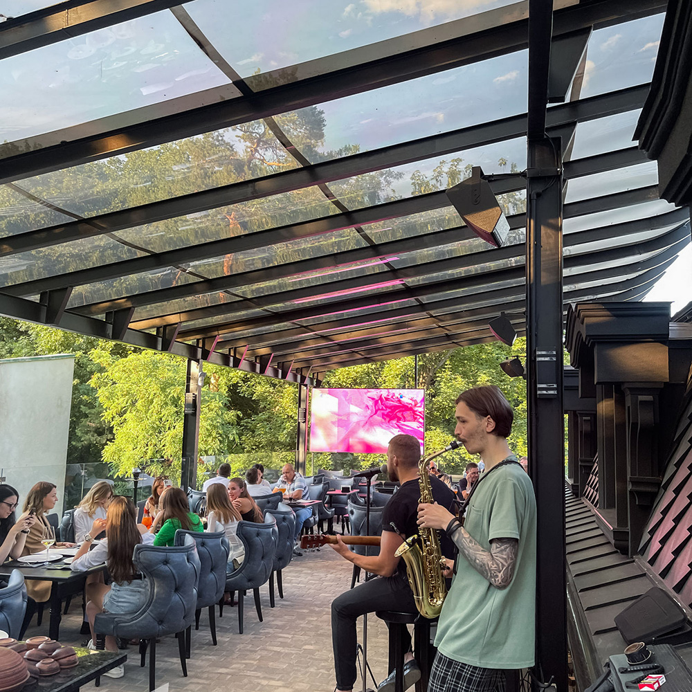 One such example is the Park restaurant complex in Chernivtsi, whose summer terrace has become a place of rest for the townspeople and numerous guests of the city – internal refugees. In order to create comfortable conditions and at least for a while to distract visitors from the horrors of war, musicians are invited here, who create a special atmosphere with live music. They are helped by acoustics from the Ukrainian manufacturer MAG Audio, namely: