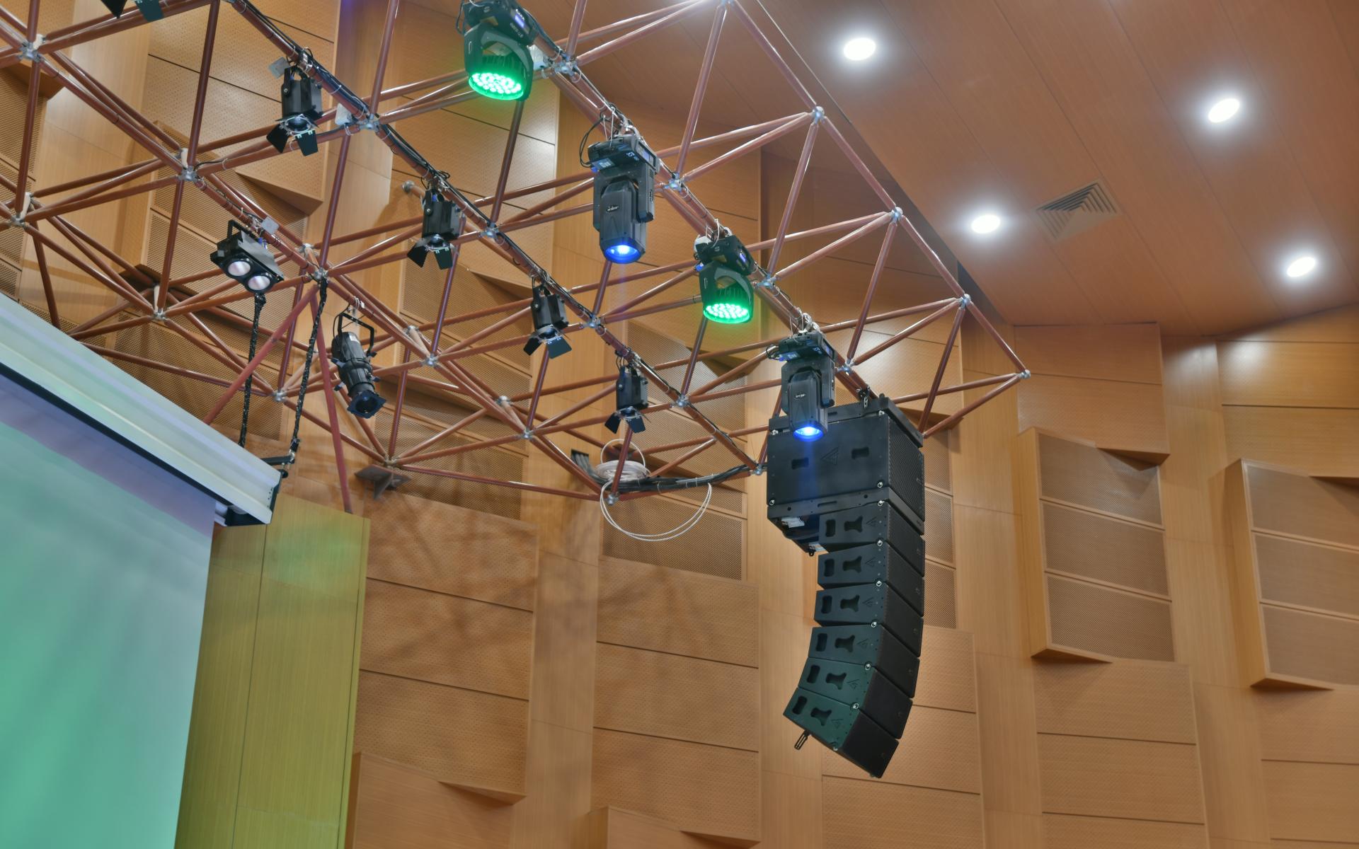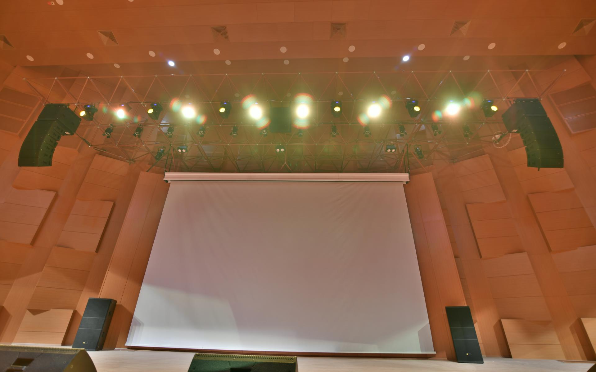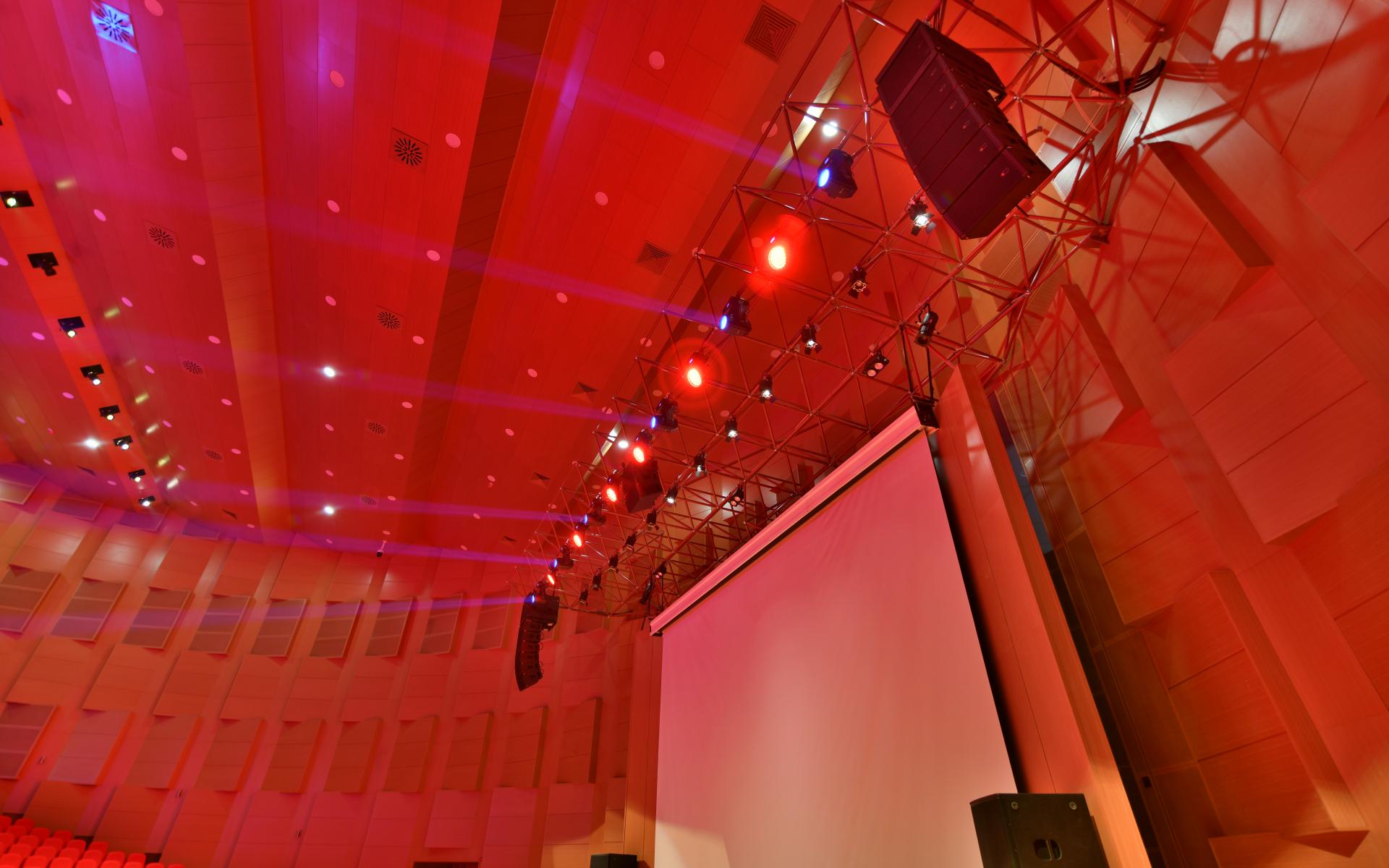 The hall is rather wide and is primarily used for lectures. Each seat has to be provided with exceptional speech intelligibility. On the other hand, the hall can be used for ceremonies and concerts, so the sound system must have considerable SPL headroom to deliver a punch when it’s needed.