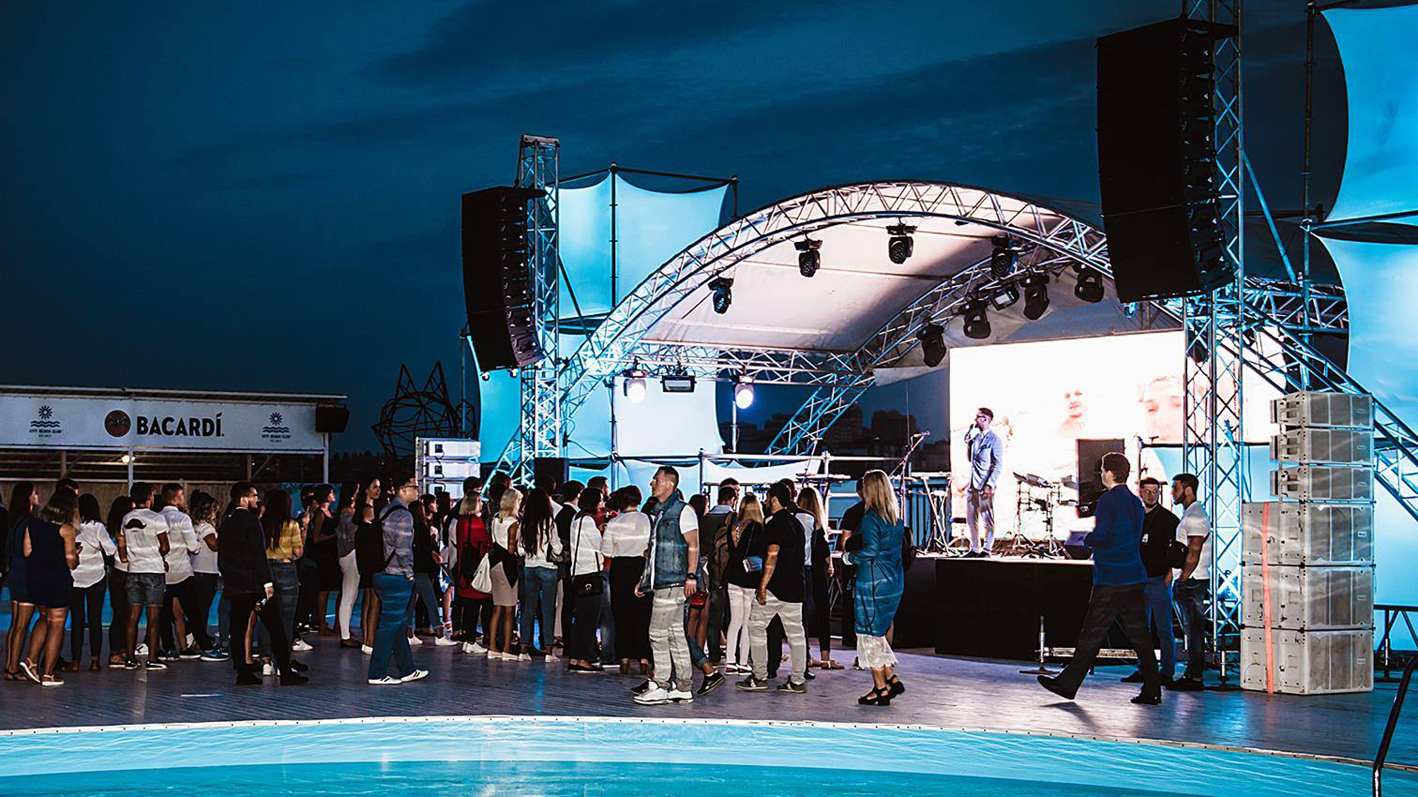 Taking into account the peculiarities of the venue (City Beach Club is an open area situated on the roof), the most optimal sound solution appeared to be a passive line array MAG Hornet. Each side of the PA contained 6 x MAG Hornet 12 modules plus 4 x MAG Hornet Sub 18 subwoofers. Such configuration, which included twelve 12-inch line array modules and eight 18-inch subwoofers, provided full coverage of the area.
