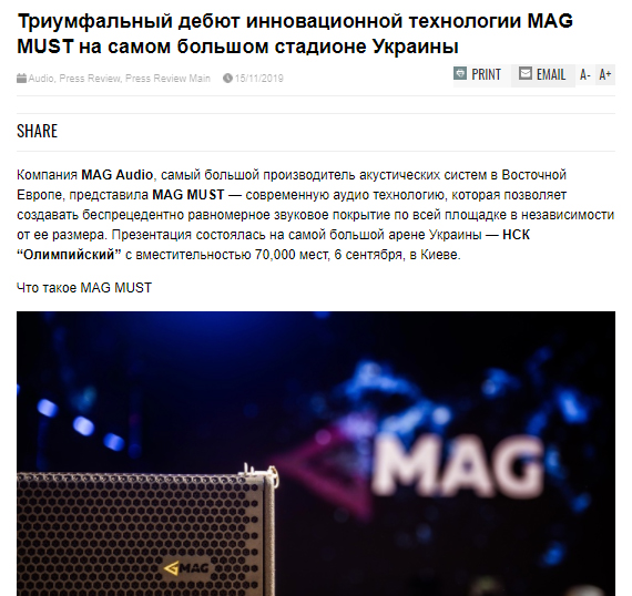 MAG Audio, the largest speaker manufacturer in Eastern Europe, has presented MAG MUST – the state-of-the-art technology which allows to achieve exceptionally smooth sound coverage across the venue of any size, from a little bar to a stadium. The presentation took place at the biggest arena of Ukraine – the 70,000-seat NSC Olimpiyskiy Stadium, on September 6, Kyiv.