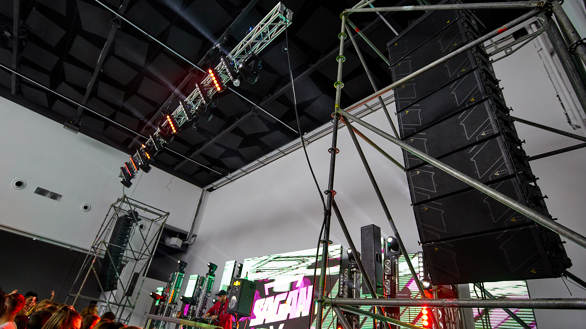 This stage is able to accommodate up to 1500 people. To cover the whole area evenly, there were deployed 8 x MAG Fly 6 and 10 x MAG Fly Sub 15 systems throughout the room. Since the tops, as well as the subwoofers are powered systems, there was no need in an external amplifier, which made the system deployment significantly easier.