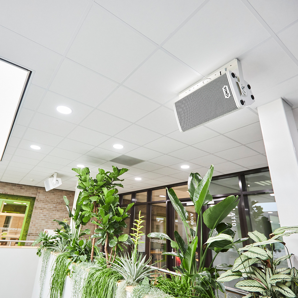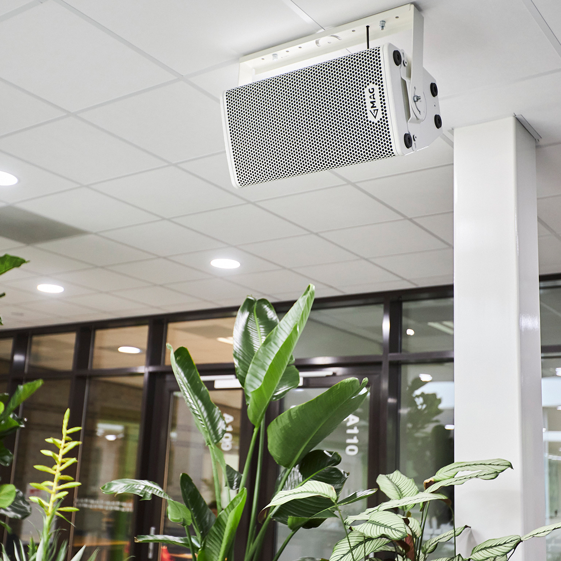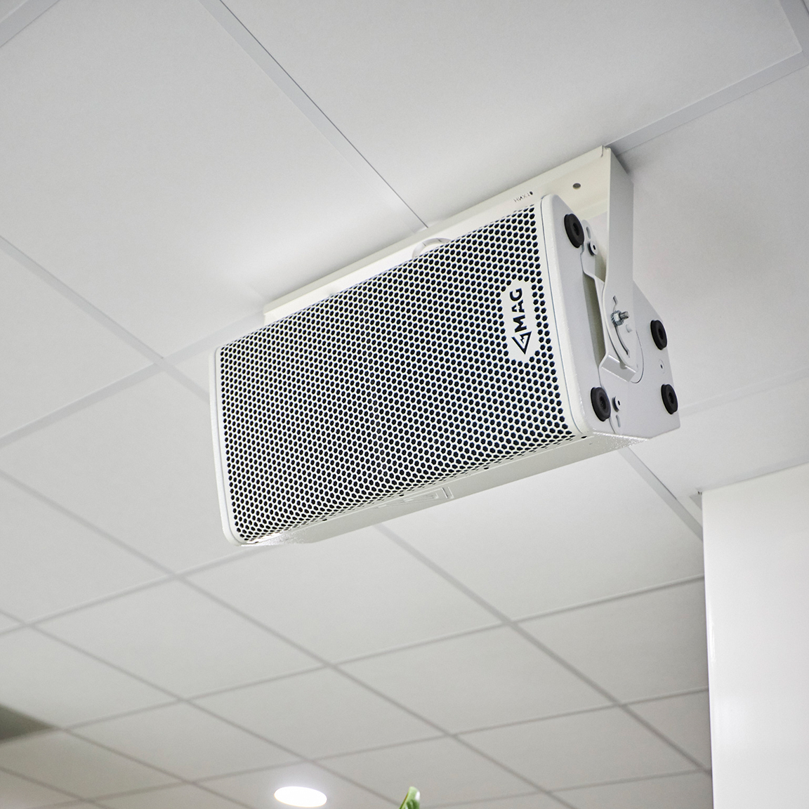 One of the requirements for this venue was a low-impact PA system that would not affect the architecture of the new building. For this reason, the installation company MMсoncept opted for two white-colored MAG NX10s to seamlessly integrate them into interior design, whilst MAG HNX12 horizontal U-brackets pan and tilt options allowed to position speakers as close to the ceiling as possible.