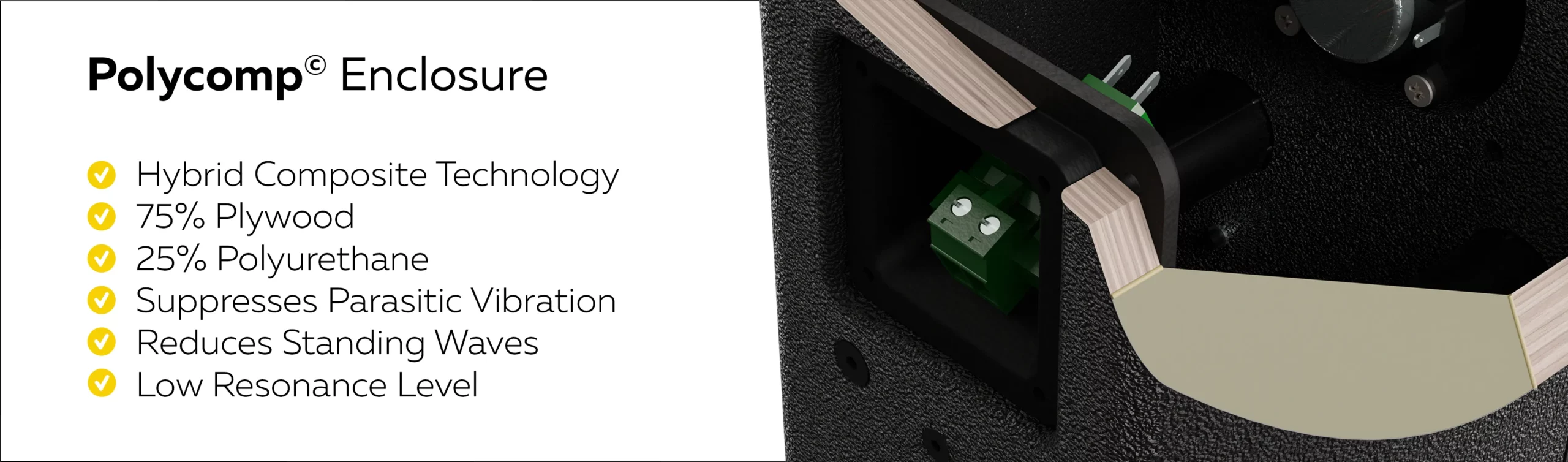 Unlike typical lightweight plastic installation boxes, AIR-C24 is built in a rigid, thick-walled composite enclosure using MAG’s Polycomp© hybrid anti-resonance technology. The cabinet consists of 75% wood and 25% polyurethane, which penetrates the plywood structure during molding to create a stiff, high-density shell. This combination of materials greatly suppresses unwanted vibrations and minimizes internal standing waves, allowing AIR-C24 to reproduce clean, accurate sound even at elevated levels.