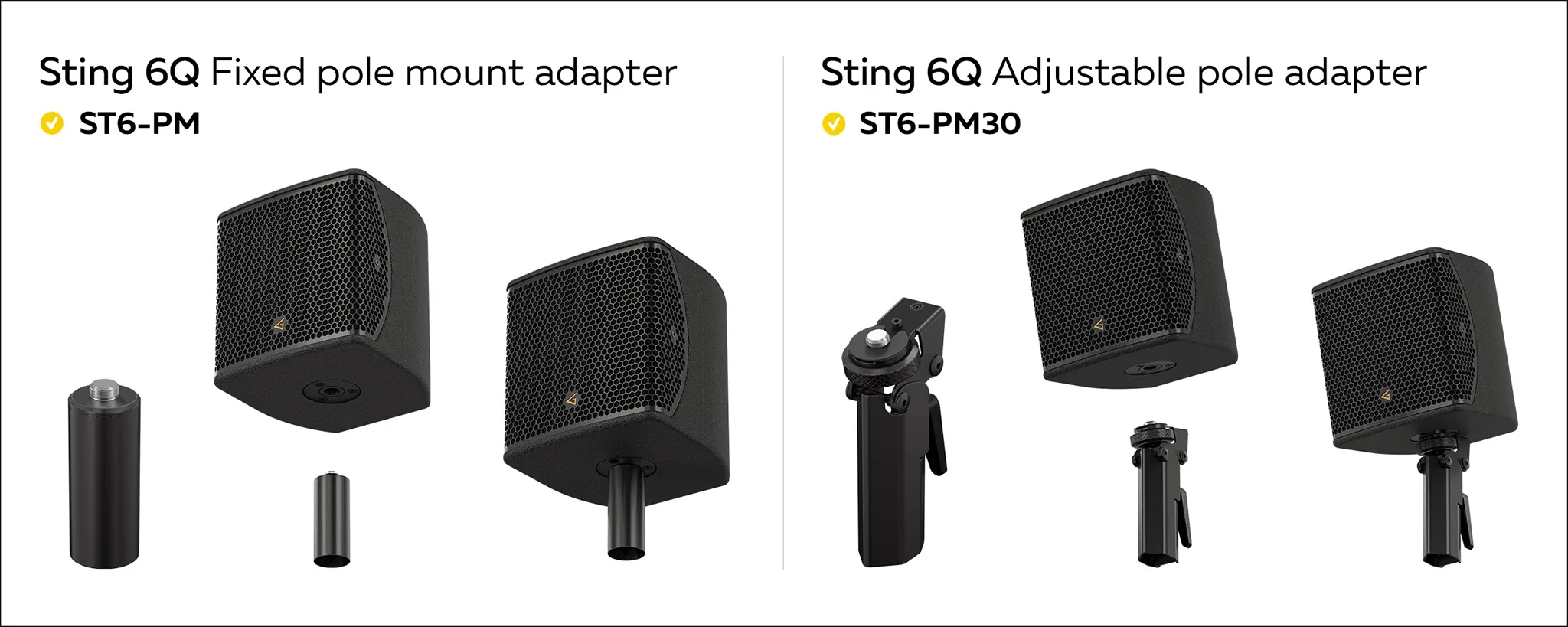 The STING 6Q is comfortable in mobile environments. It can be placed directly on a standard 5/8" microphone stand for the quickest and most compact portable setup, or mounted on a 35 mm pole via optional adapters for improved stability and compatibility with subwoofers. A dedicated floor tilt-adjustable stand is also available for situations where accurate front-fill positioning and angle control are required. Two Speakon connectors provide straightforward mobile connectivity and signal chaining.